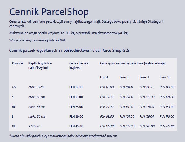 Poniżej cennik nadania paczki GLS w naszym punkcie.
